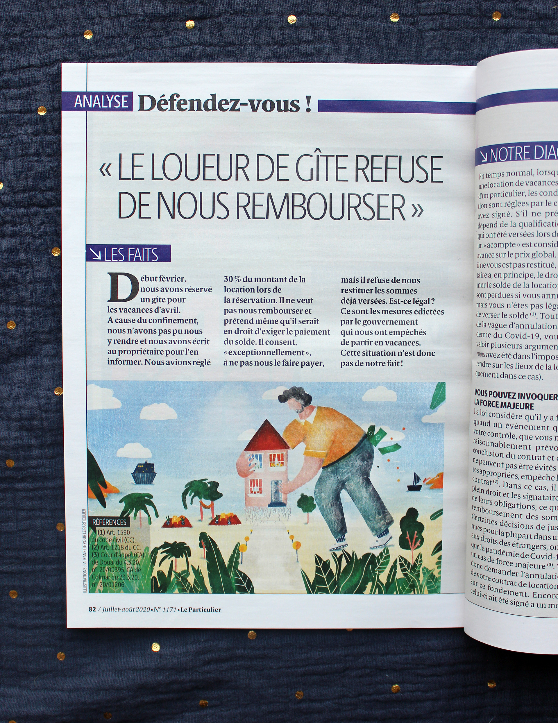 Illustrations réalisées pour le magazine du groupe Figaro « Le Particulier » sur les locations de vacances perdues dû au confinement, ainsi que sur les mesures à prendre pour un report de location.